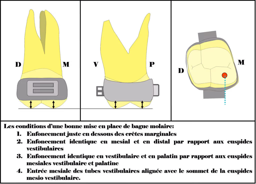 d. En vue occlusale, l’entrée mesial du tube molaire doit être alignée avec le sommet de la cuspide mesio vestibulaire. Ceci évite la rotation parasite de la molaire due à la mauvaise position de la bague.3 - Laisser les bagues en place pendant quelques minutes avant de les sceller (le temps de fabriquer le QH).4 - Si l’on a décidé de placer les bagues et faire le collage des boîtiers pendant le même rendez-vous, il faut essayer les bagues, les sceller d’abord et ensuite faire le collage. La distance X sera fixée et servira de référence pour la position verticale des gorges des boîtiers.