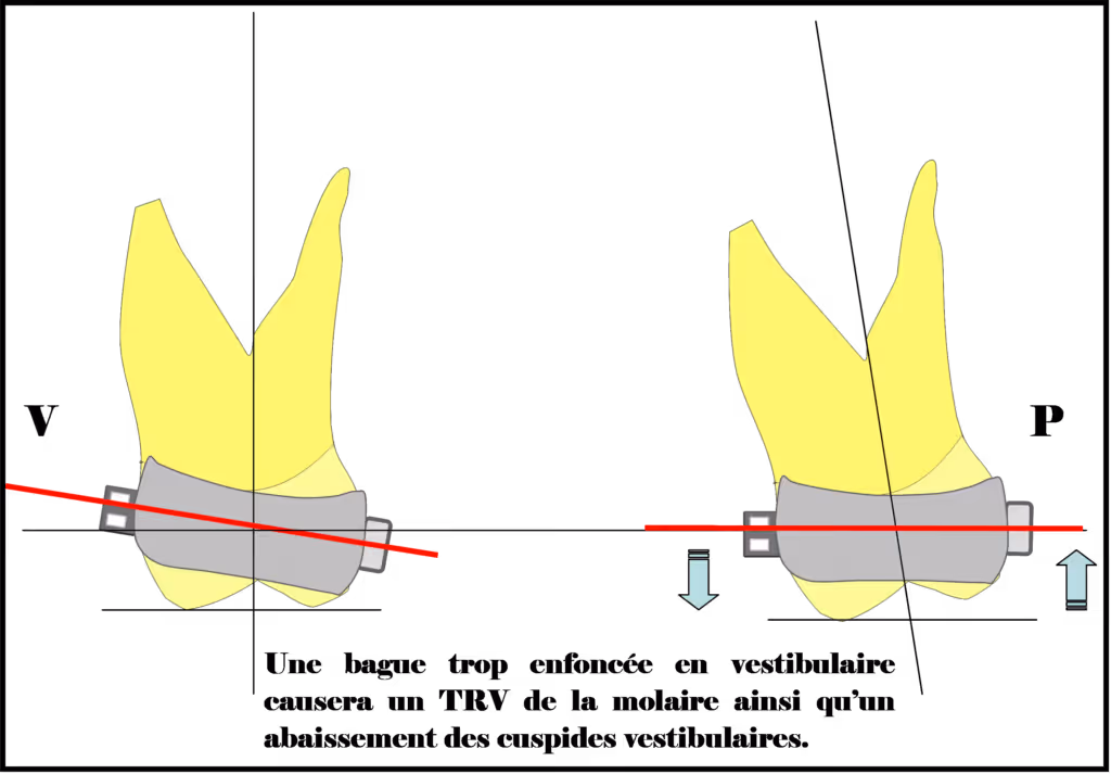 b. La bague doit être enfoncée autant en mesial qu’en distal. Cliniquement cela signifie que la hauteur des cuspides vestibulaires, mesiale et distale, au-dessus du rebord de la bague doit être la même. Ceci évite la bascule parasite de la molaire due à la mauvaise position de la bague.Astuce clinique : Afin de respecter cette règle le dernier coup pour enfoncer la bague doit être en distal.c. La bague doit être enfoncée autant en vestibulaire qu’en palatin. Cliniquement cela signifie que la hauteur des cuspides mesiales, vestibulaire et palatine, au-dessus du rebord de la bague doit être la même. Ceci évite le torque radiculaire parasite du a la mauvaise position de la bague.Astuce clinique : Afin de respecter cette règle le dernier coup pour enfoncer la bague doit être en palatin